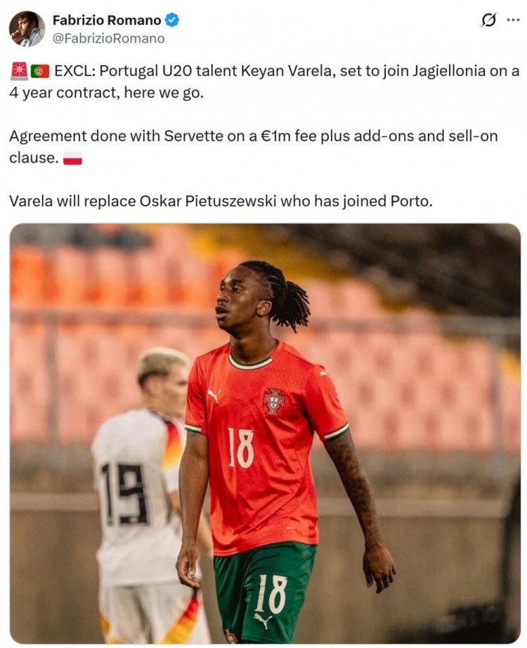 1月17日讯 据知名记者罗马诺报道,19岁葡萄牙边锋瓦雷拉将加盟波兰甲级联赛俱乐部乔治罗尼亚,Here we go!